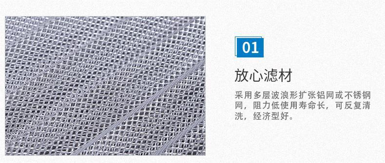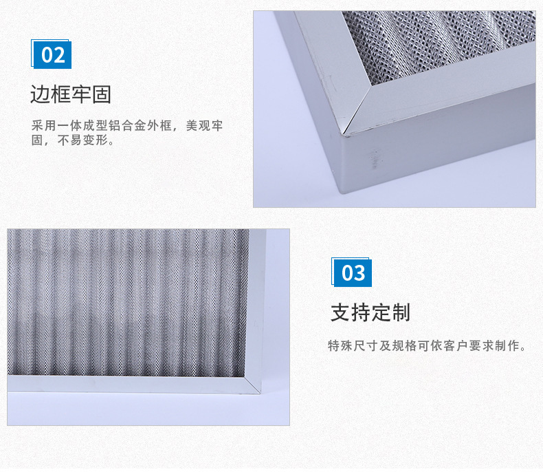 鋁波紋網(wǎng)過濾器采用多層鋁網(wǎng)經(jīng)輾壓成波浪形,以正確的角度彼此交叉疊合排列而成,多層金屬鋁波紋網(wǎng)是以不同的密度,孔徑由粗到細(xì)的排列,使空氣通過濾網(wǎng)時(shí)多次改變流動方向,增大其集塵能力及效率。