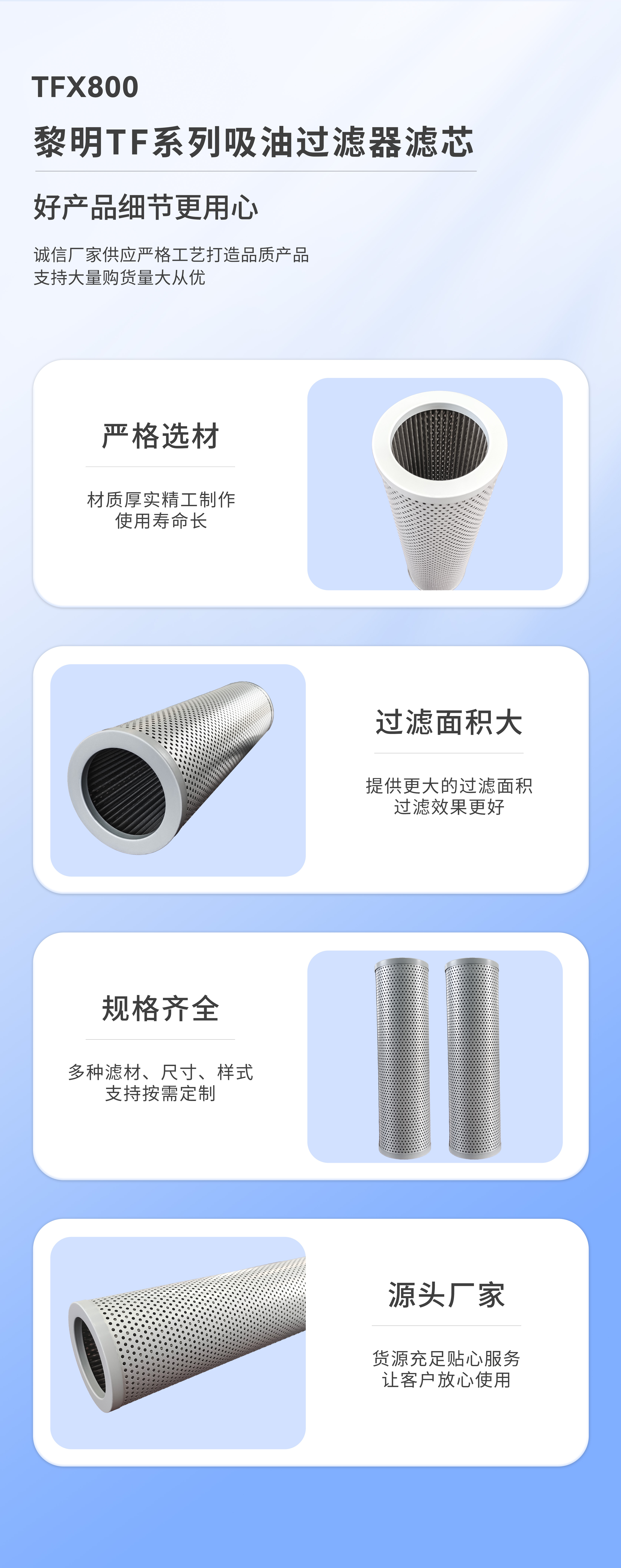 【產(chǎn)品簡介】:液壓油濾芯是輸送介質(zhì)的管道系列中不可缺少的部分,通常安裝在液壓系統(tǒng)的進(jìn)口端過濾中用來濾除流體介質(zhì)中的金屬顆粒,污染雜質(zhì),用于保護(hù)機(jī)器設(shè)備的正常運(yùn)行工作。流量:800L / min 精度:80、100、180微米可選。